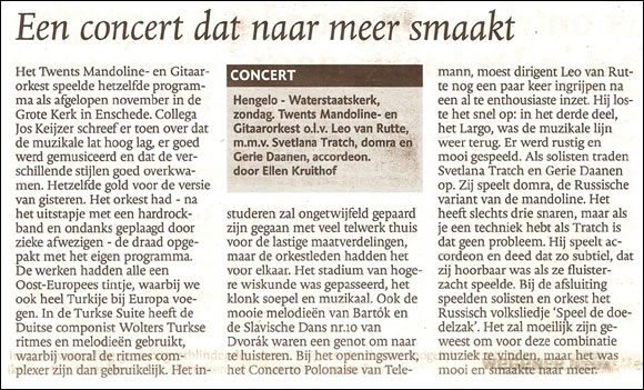 Recensies ‘Een concert dat naar meer smaakt’, Dagblad Tubantia Dagblad Tubantia, november 2007 Gerelateerd ‘Verlangen en Weemoed op de gevoelige snaar’, Dagblad Tubantia Impressies uit Oost-Europa (Grote Kerk Enschede) 11 november 2007